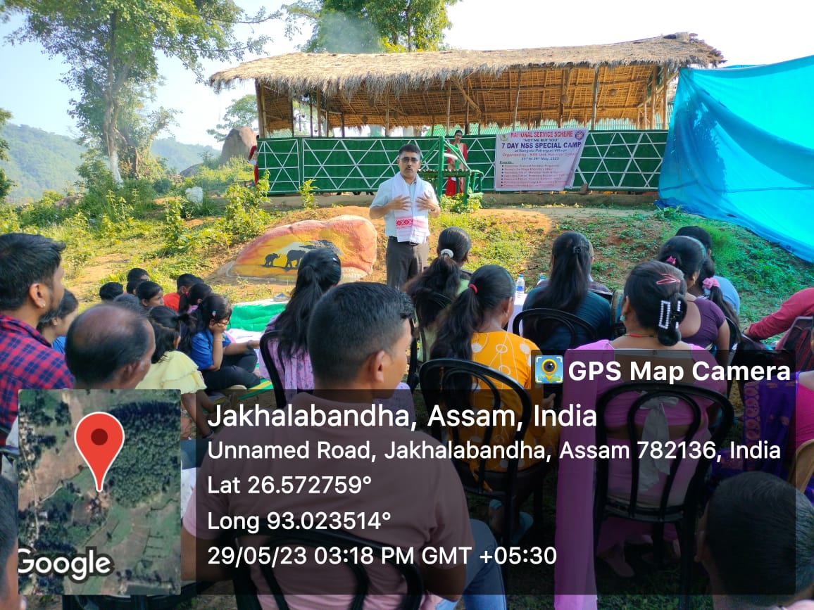 | 62 | NSS SPECIAL CAMP, 2023 DAY 5- PROTECTING ENVIRONMENT FROM HOME | On day 5 of the Special Camp, an awareness talk on ‘Protecting Environment from Home’ was organized to spread environmental awareness among the villagers. Issue like environmental preservation is more crucial for villagers like Rangolu Paharguri living next to the Kaziranga National Park. Dr. Anupam Kumar Medhi and Mr. Gosaisan Das, Assistant Professors, Dept of Zoology, Kaliabor College attended the occasion as guest speakers. The speakers had a very fruitful discussion session with the villagers on how they can contribute for the preservation of Kaziranga. Mr. Gosaisan Das also discussed issues like Snake bite & precautions with the villagers. | 2023-05-27 | View File |